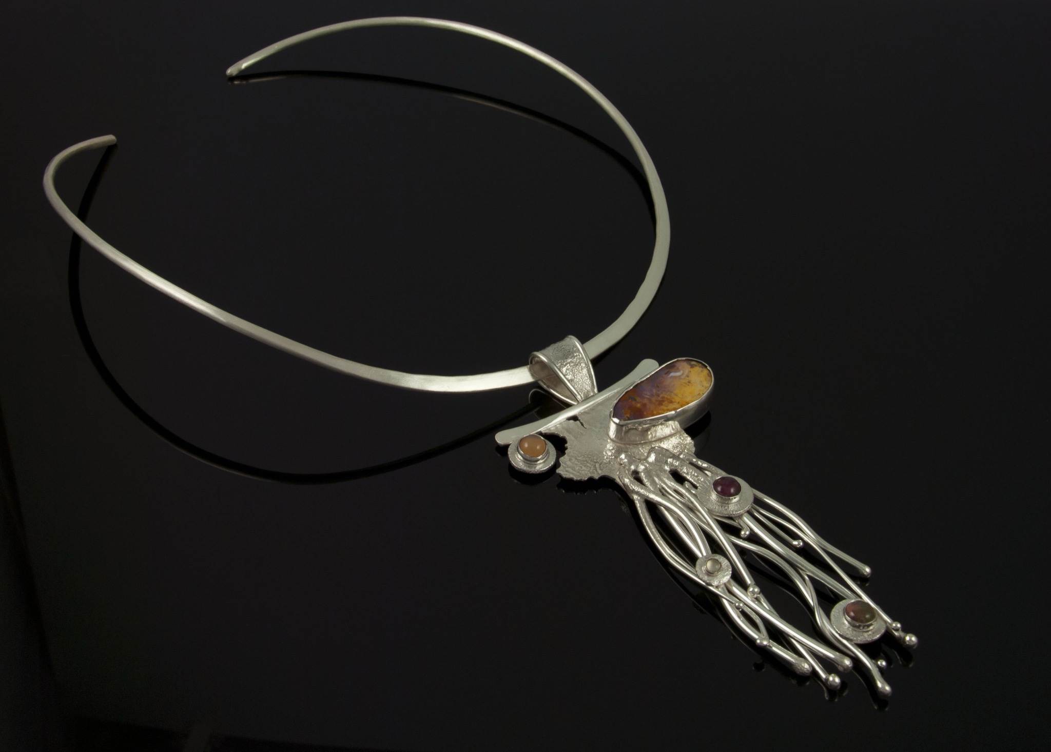 Silver necklace with asymmetrical teardrop shapes and opal.