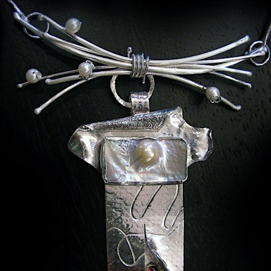 Very happy with what the muse brought to the table today. My newest piece incorporates a blister pearl. “Haul Water, Carry Sticks”, is a semi-representational piece depicting Woman. Hintings towards multiple ethnicity, it honors all women and the power that they embody. The textures in this piece were made with reticulation and the use of the rolling mill. Even the links of the chain are reticulated.