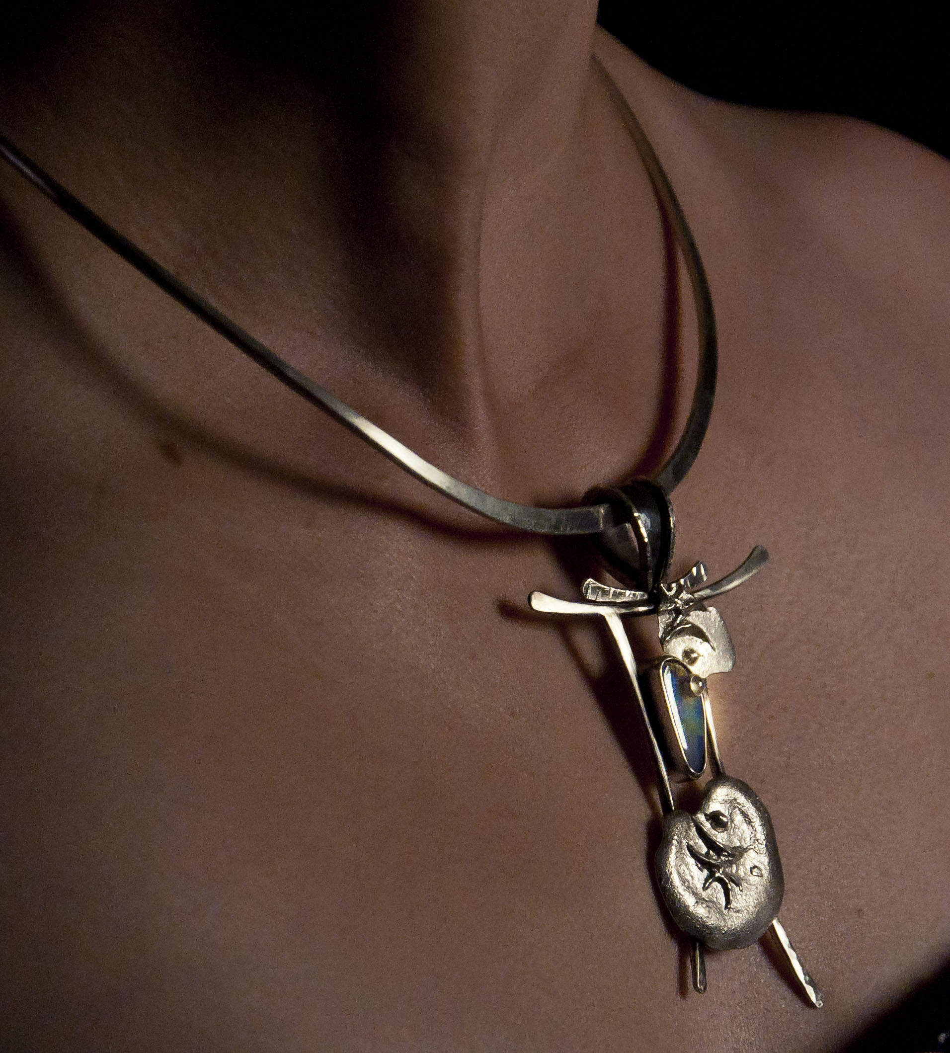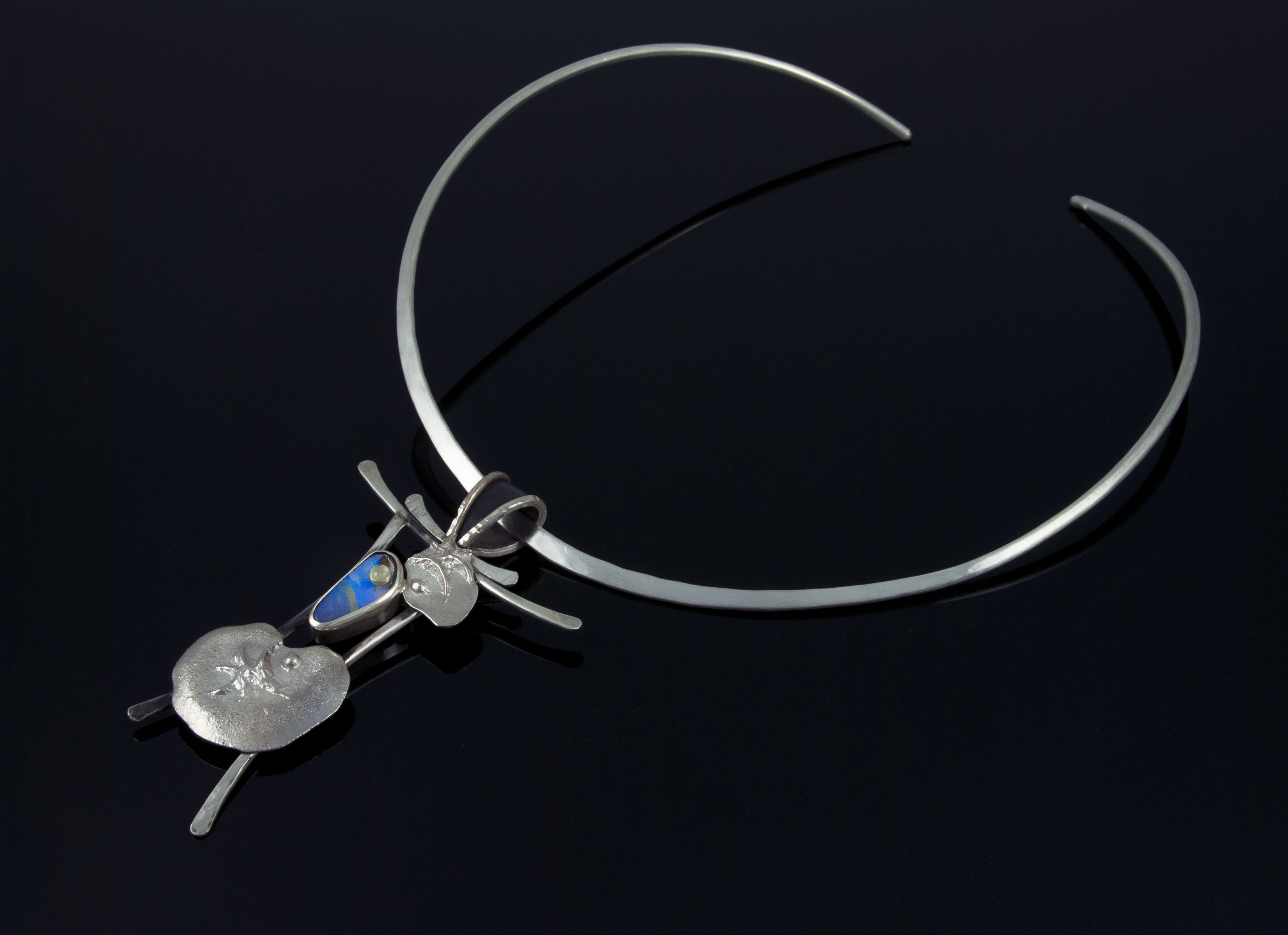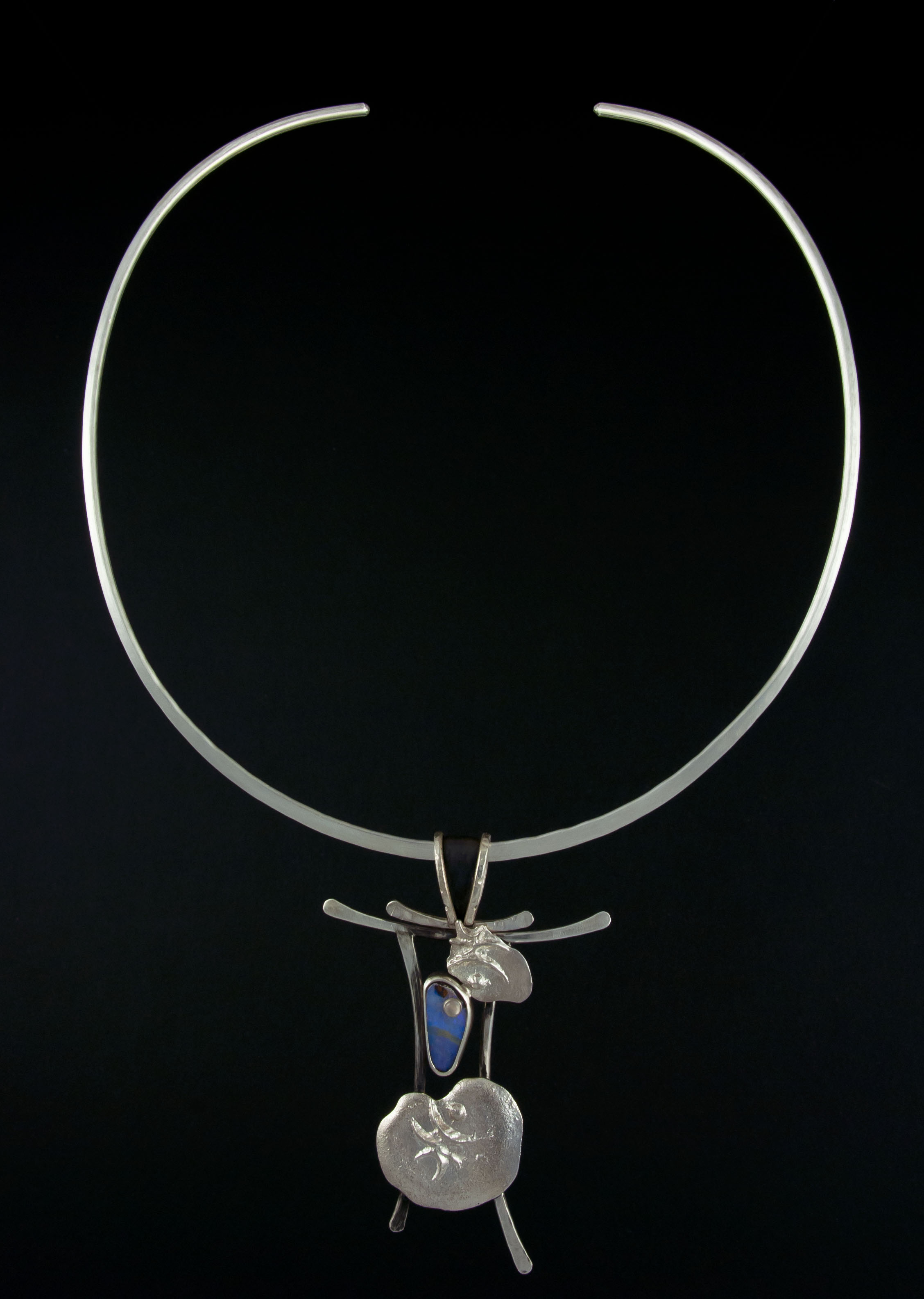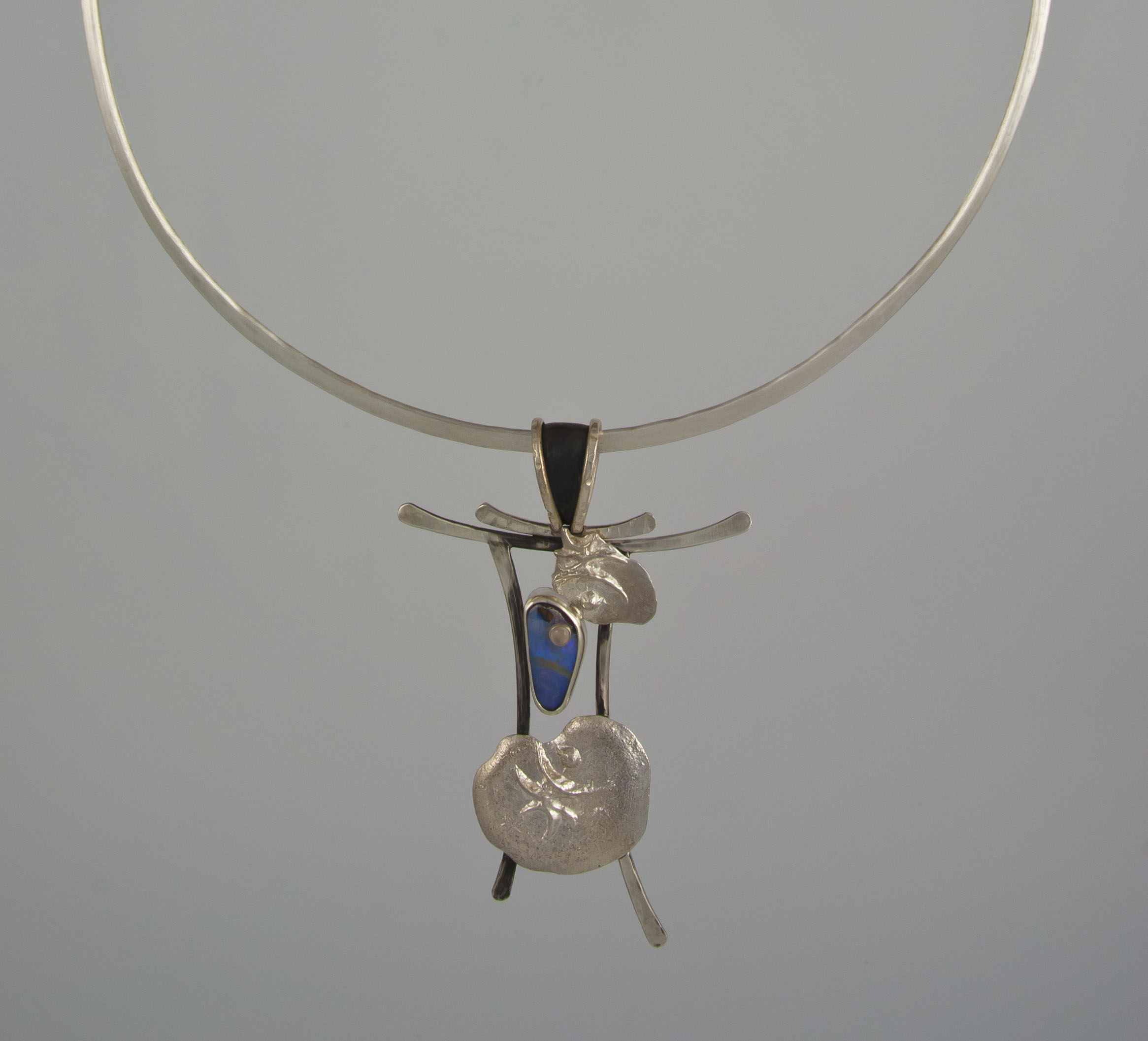 Silver necklace with asymmetrical teardrop shapes and opal.
