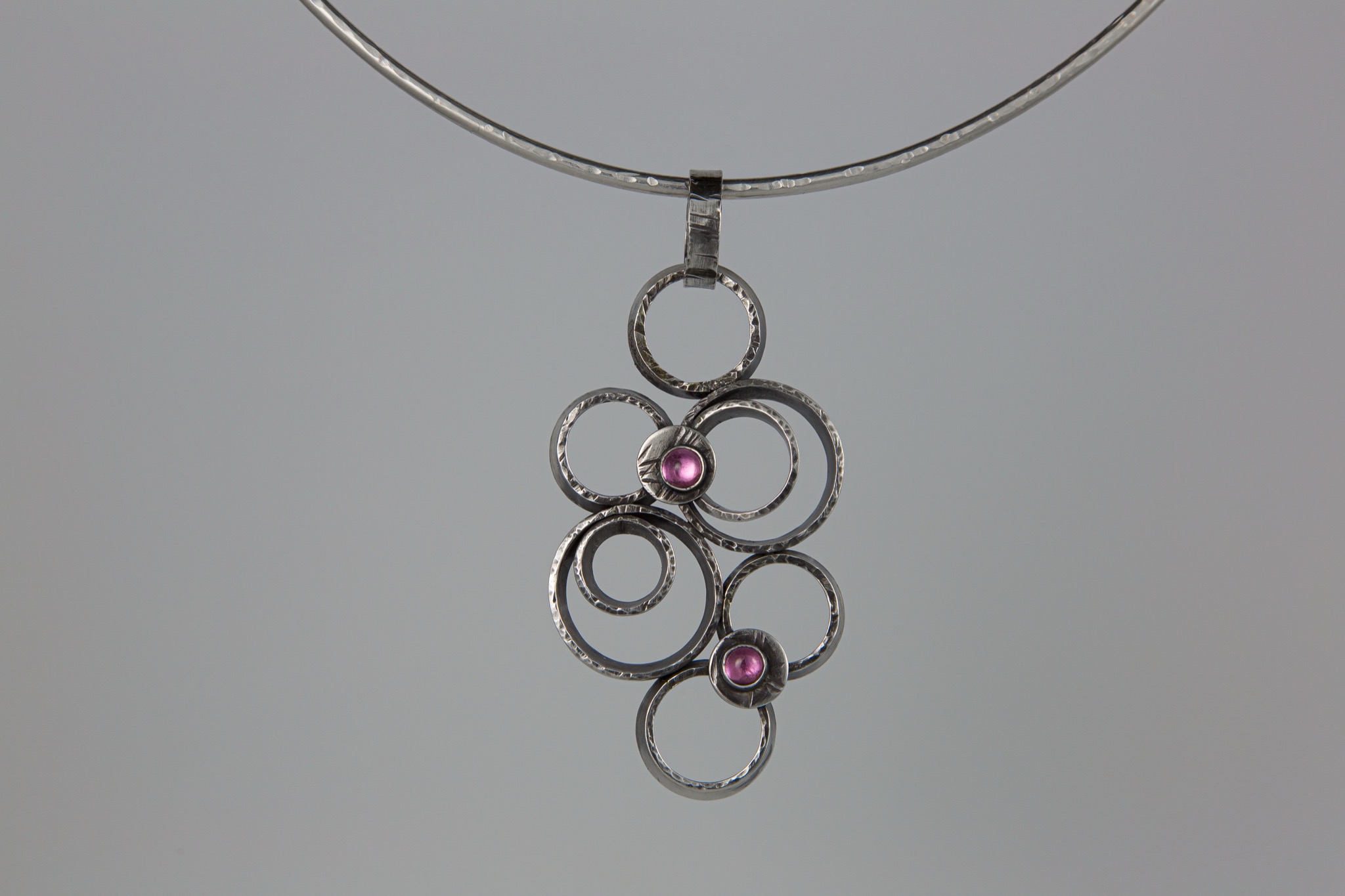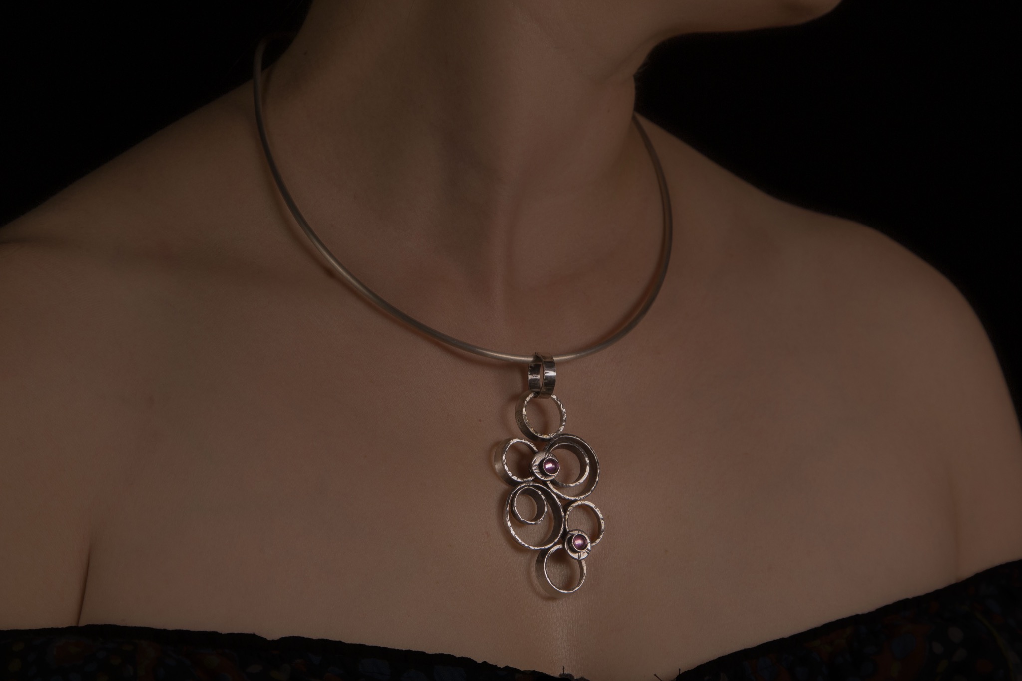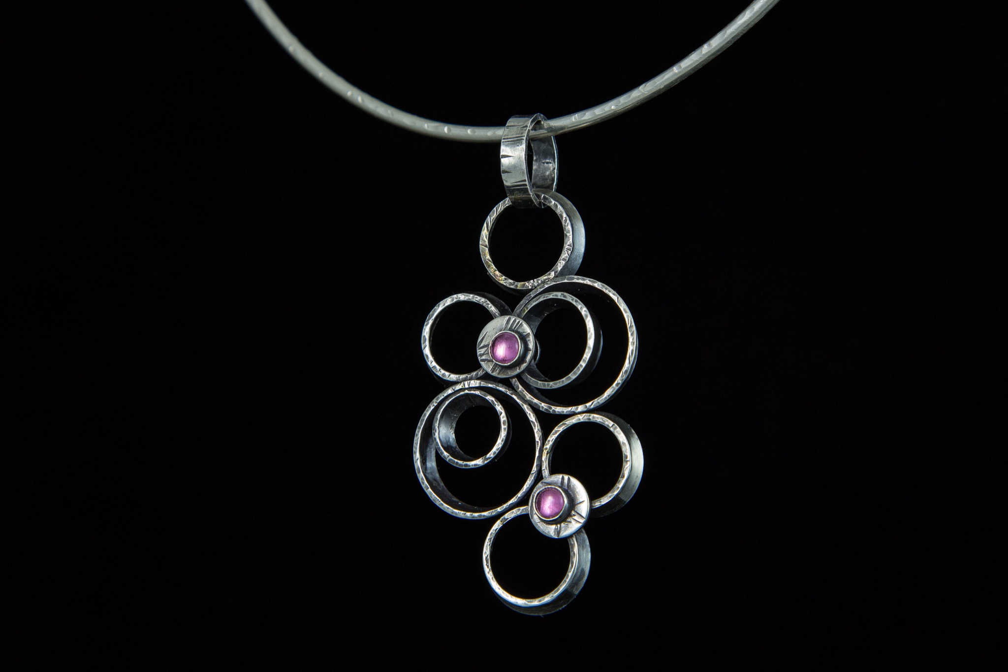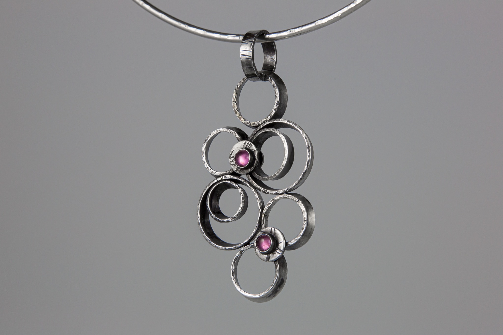 Silver necklace with abstract swirl pendant and pink gemstones.