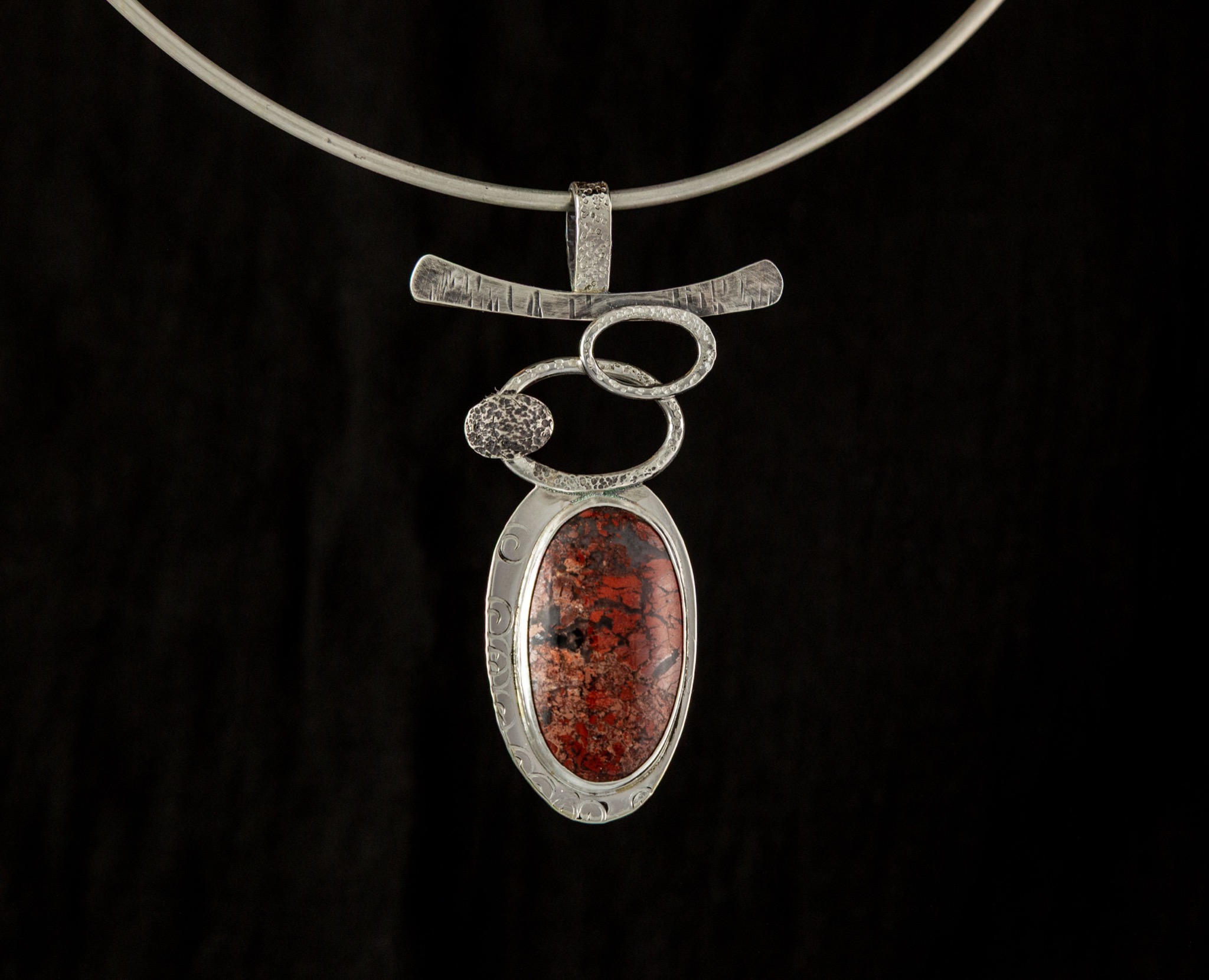 Silver pendant with red stone on a black background.