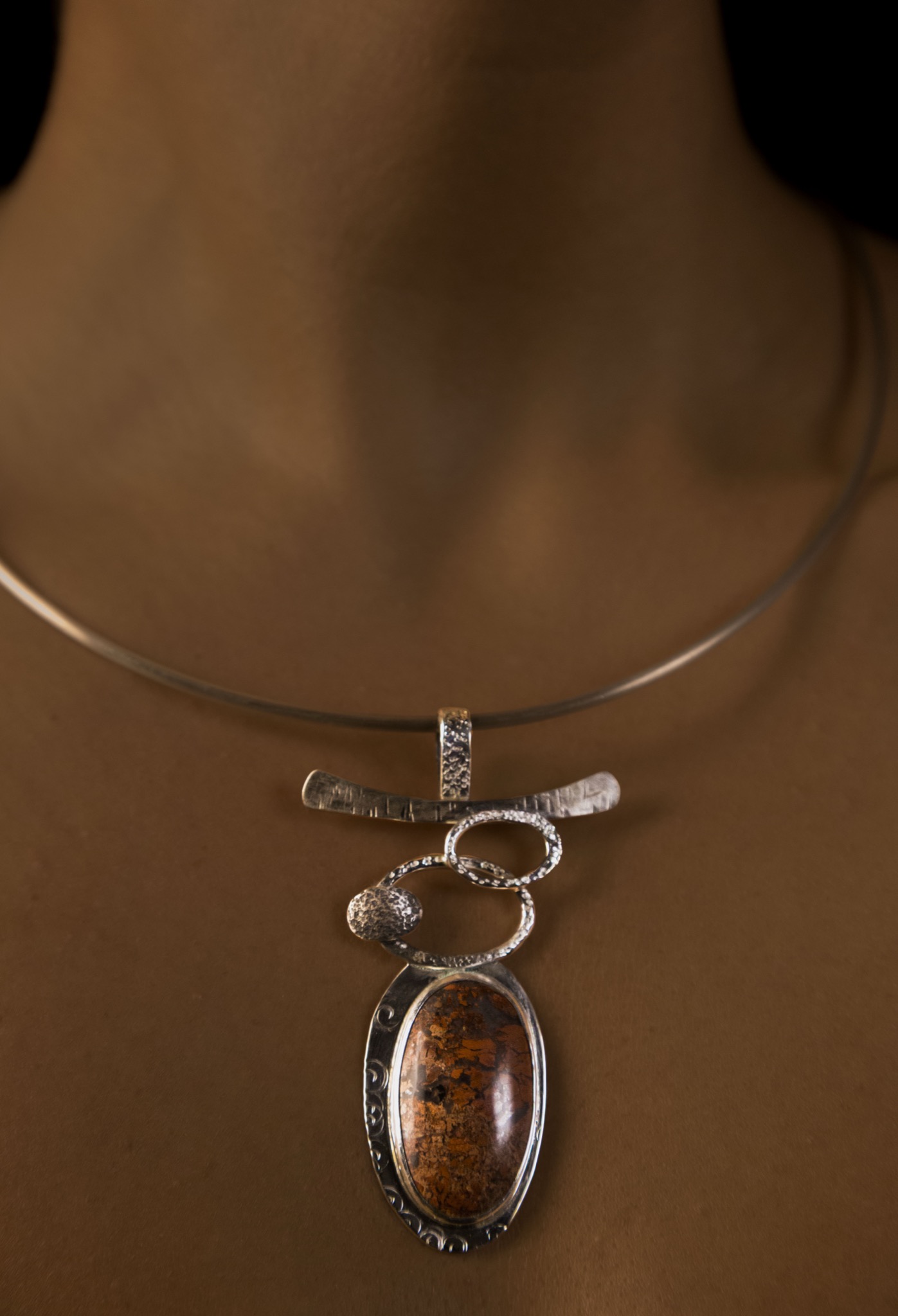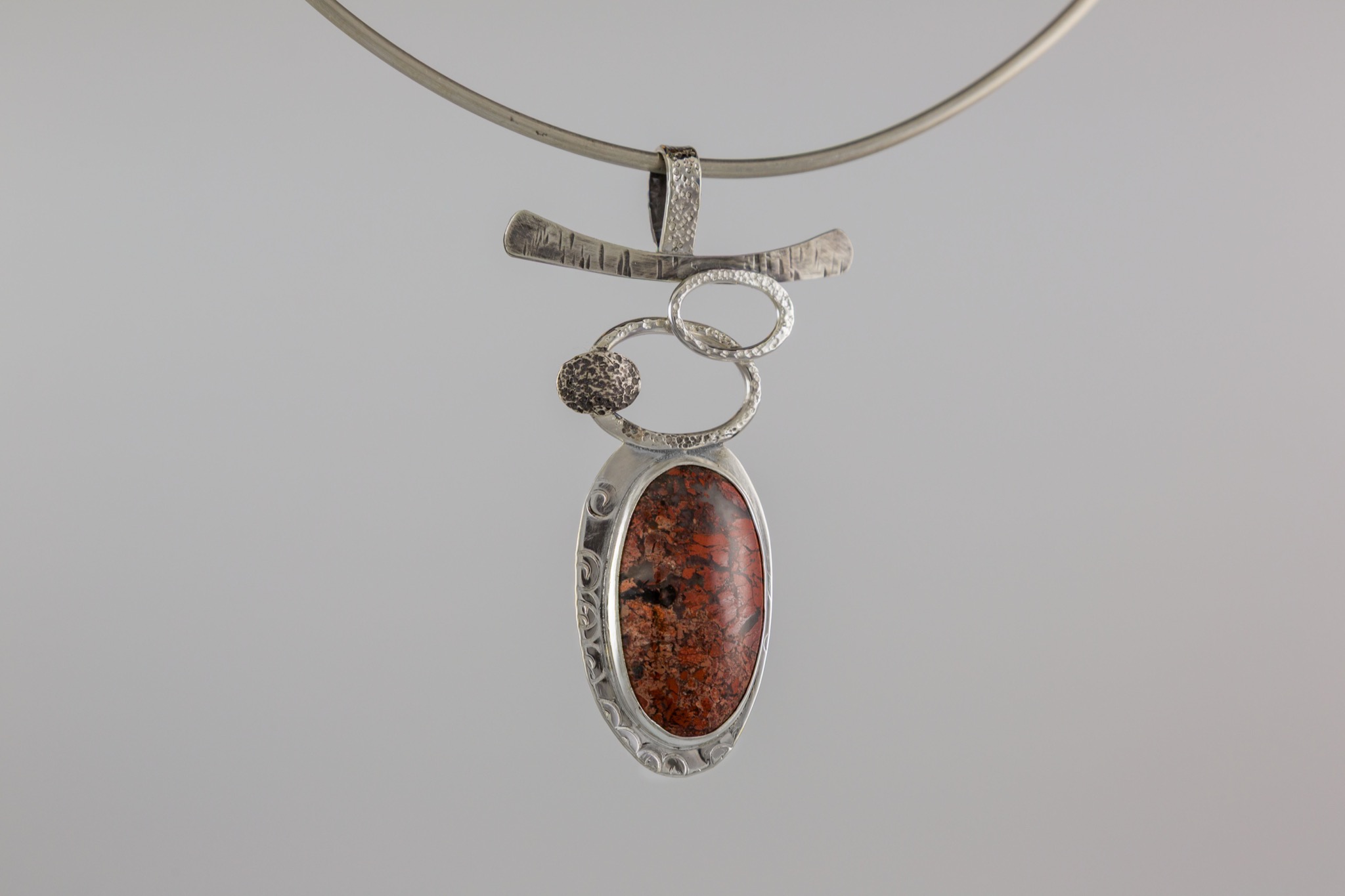 • Photograph of a silver pendant necklace.