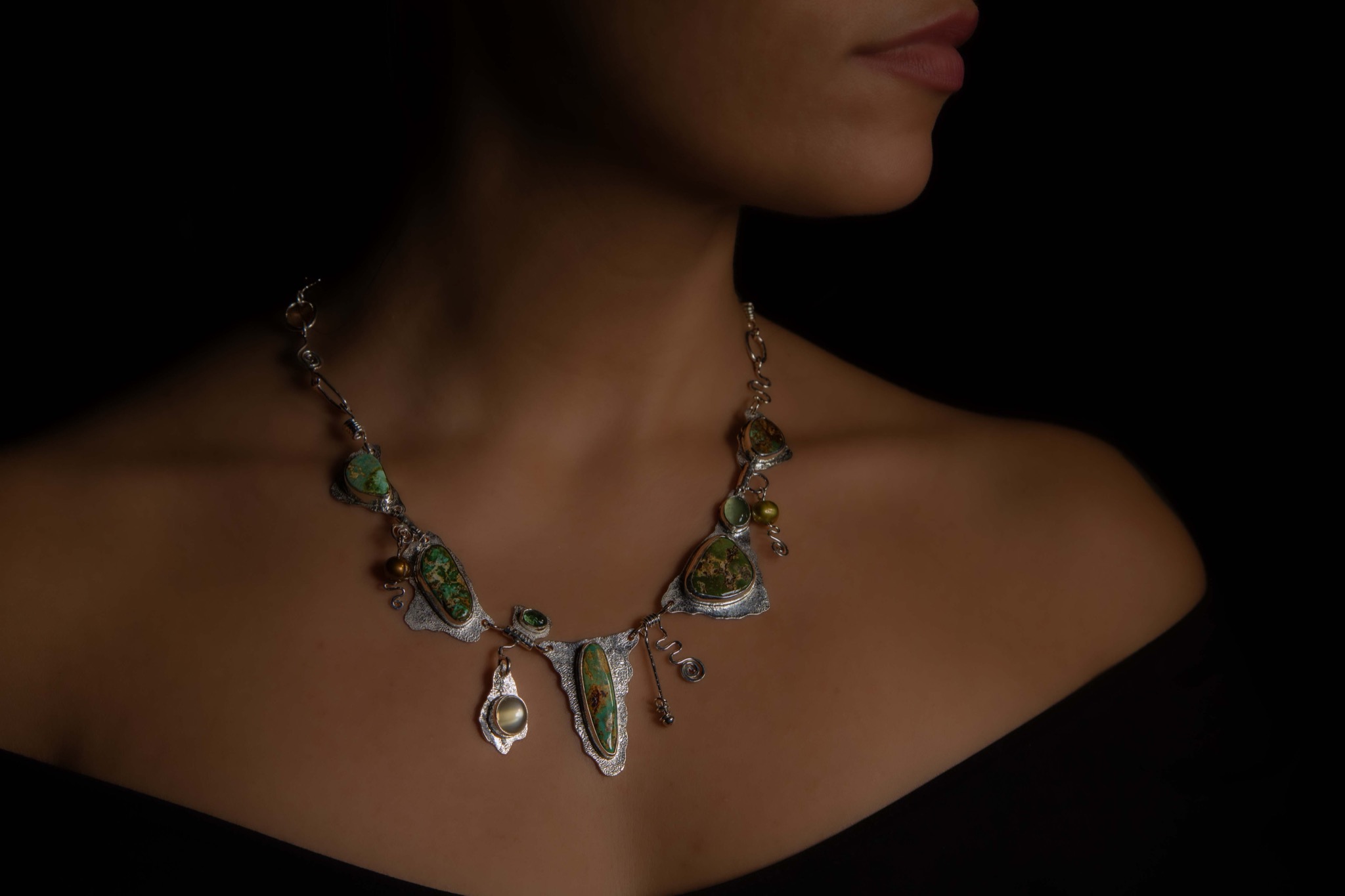 The combinations of stones (all greens) in this whimsical design reminds us that what we have is often greater than what we pine for. Cerrillos Turquoise comes from only one mining district in Los Cerrillos, New Mexico.