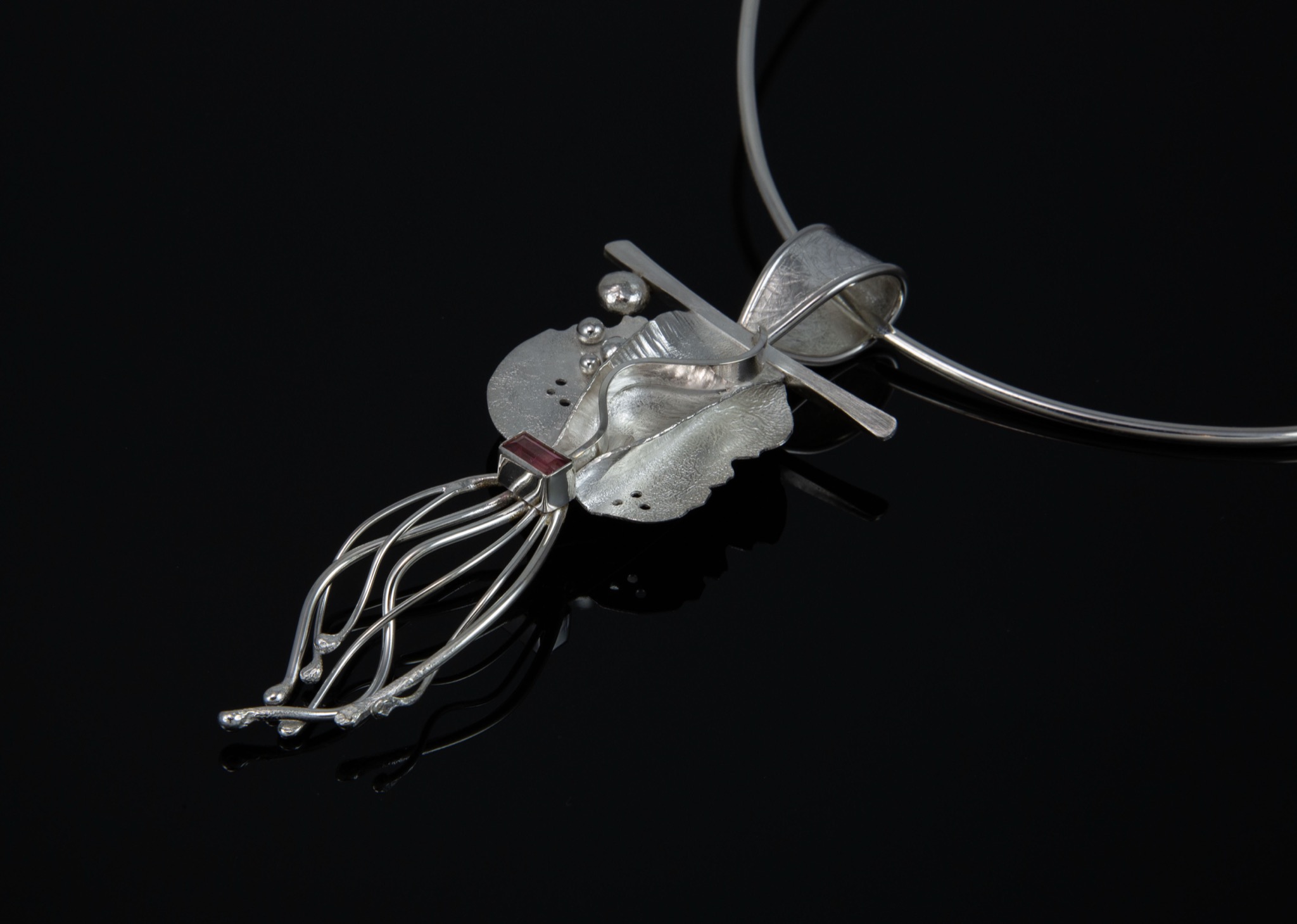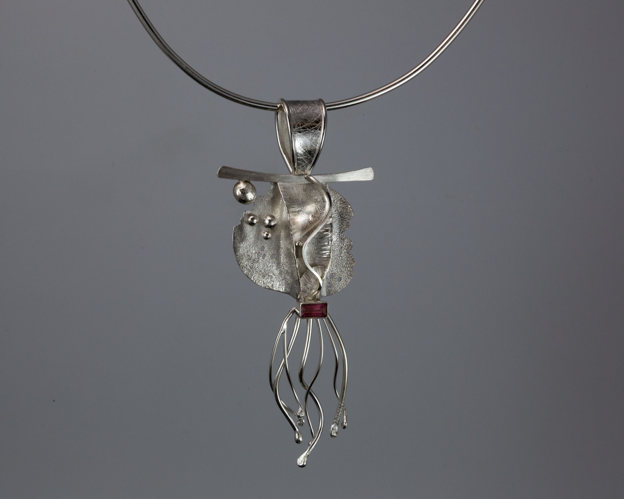 Jelly Jelly Jelly One of natures amazing creatures, the jelly fish is represented in this abstract work. Artist Blair Anderson Metals Sterling Silver Stones Pink Tourmaline Techniques Fold forming $595.00