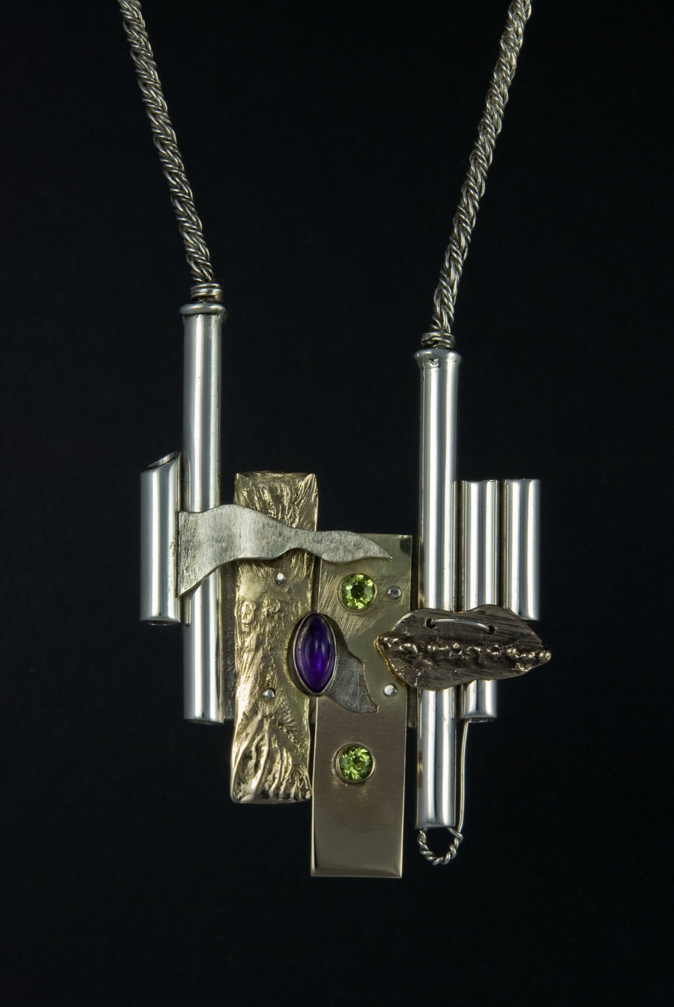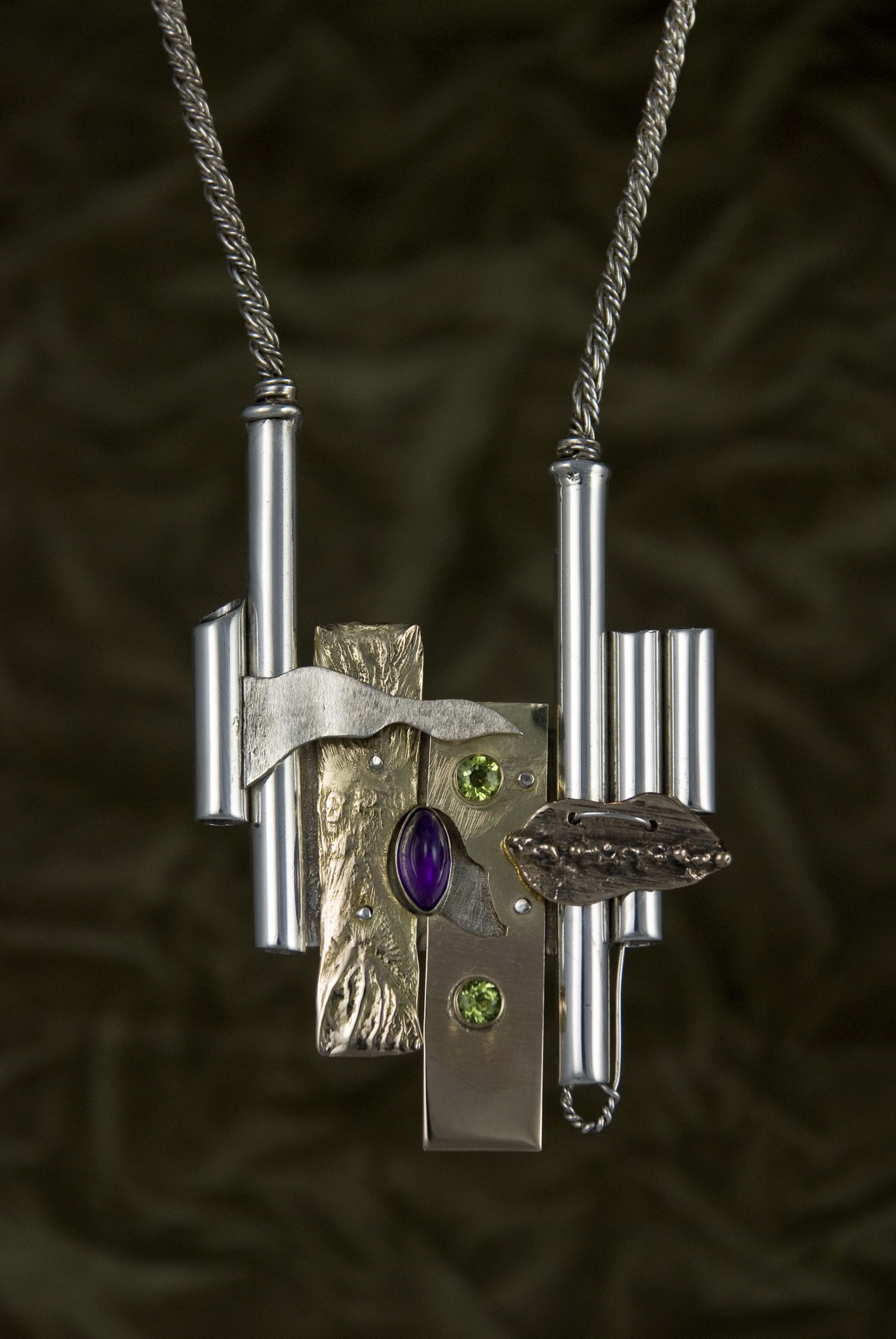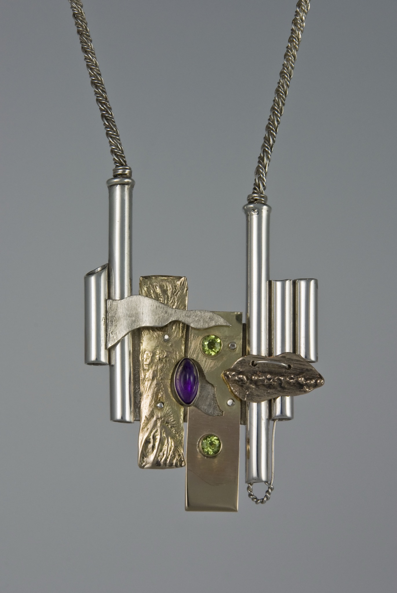 Silver artistic necklace with glass and stone accents.