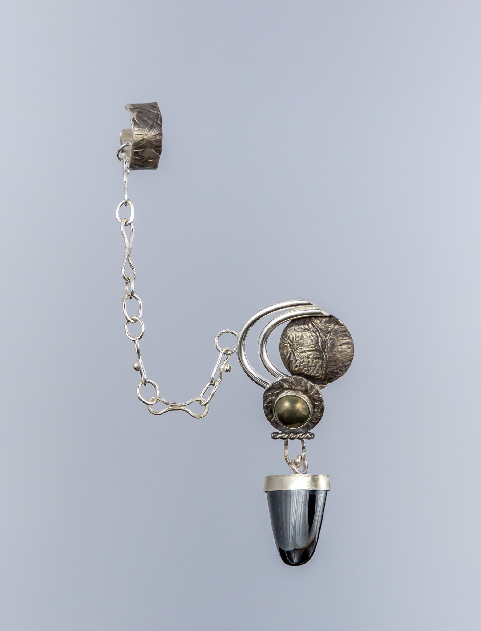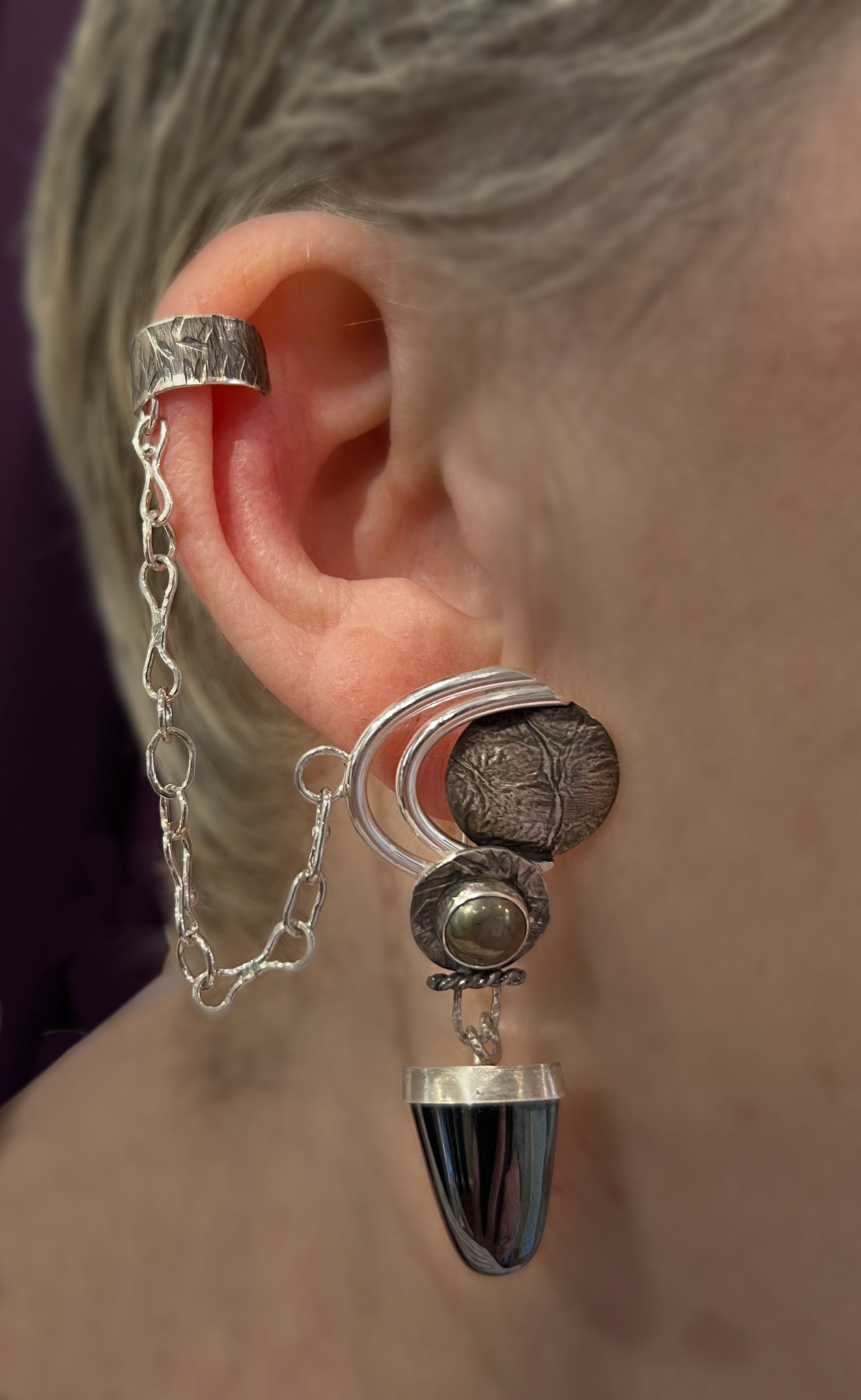 Bajorans wear large, chained earrings and ear cuffs called d'ja pagh (soul) on their right ears, as symbols of their religious faith. Before the war against Cardassian occupation, the earring also symbolized one's d’jarra (caste). The character Ro Laren lost her faith so wore her earring on her left ear.