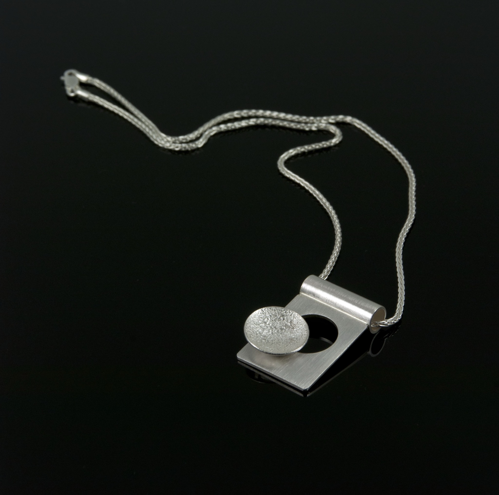 Silver necklace with geometric pendant, photograph.