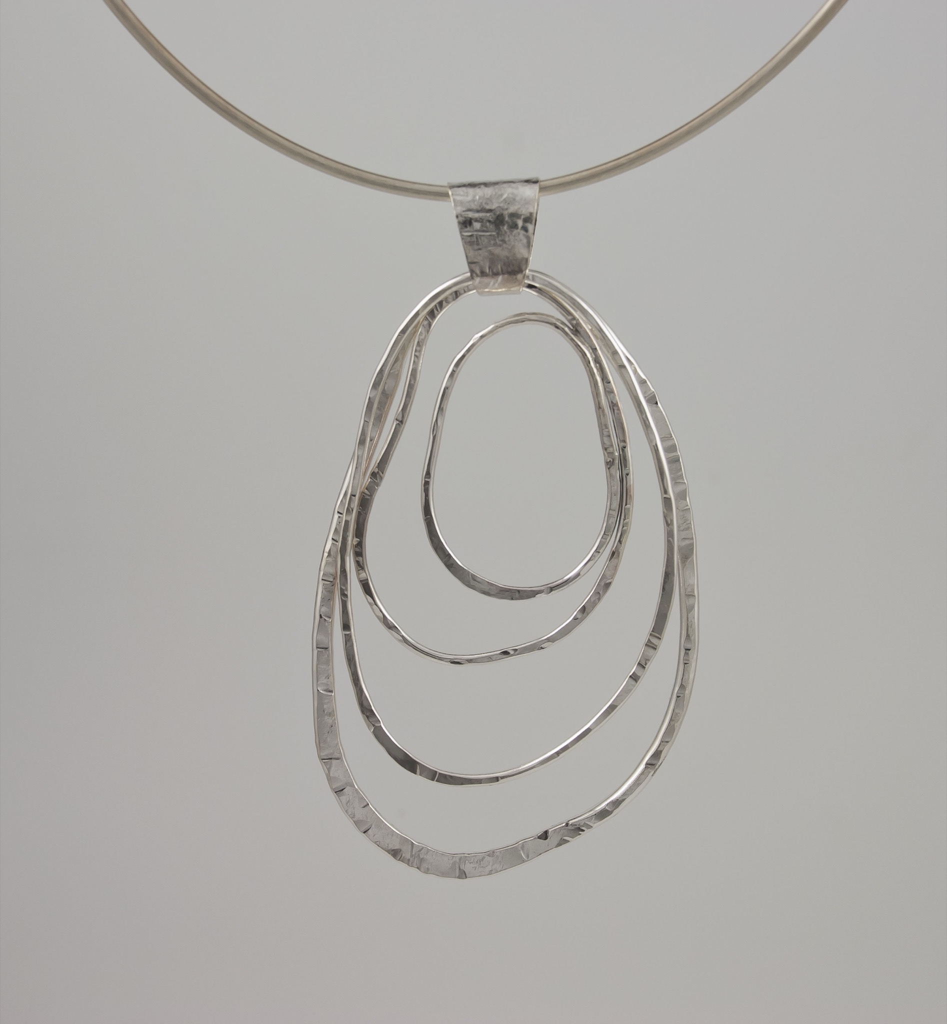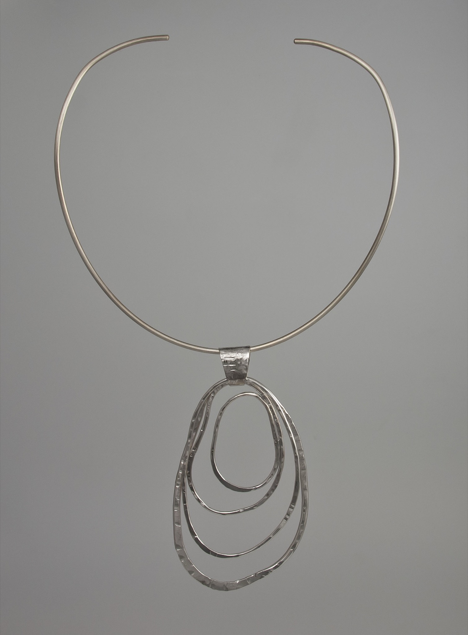 • Silver choker necklace with layered pendant, studio photograph.