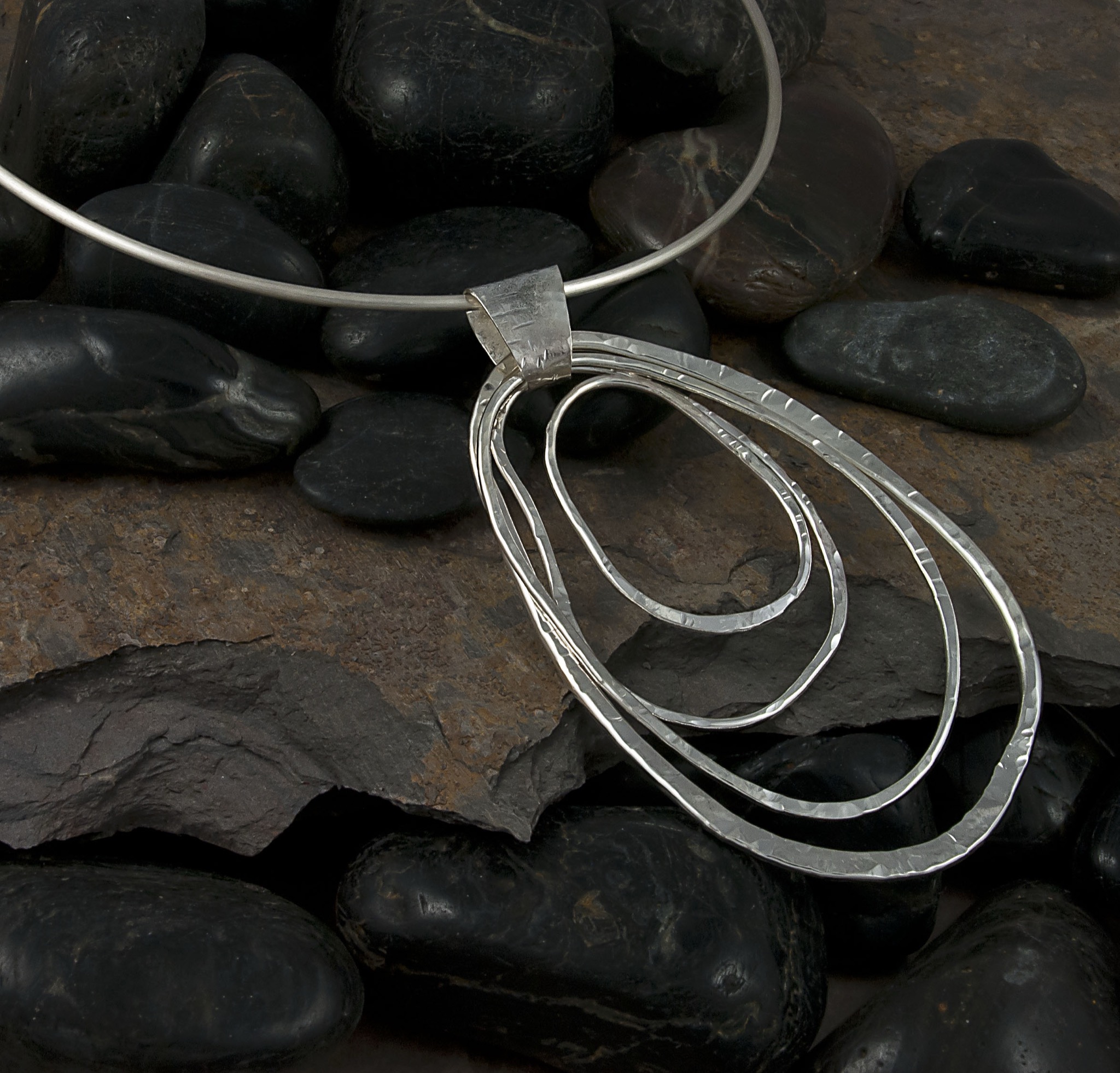 • Silver pendant necklace on dark stones, studio photograph.