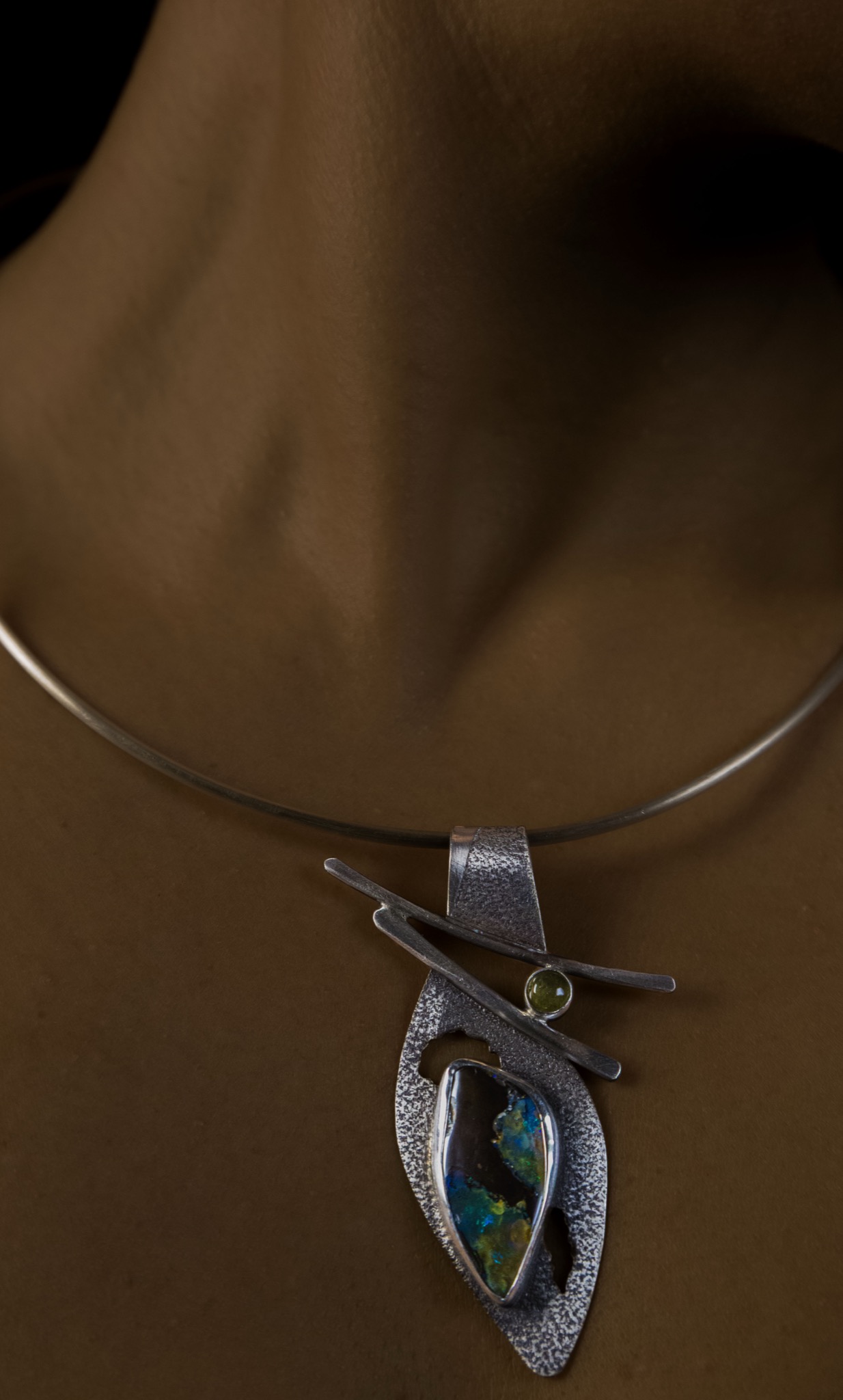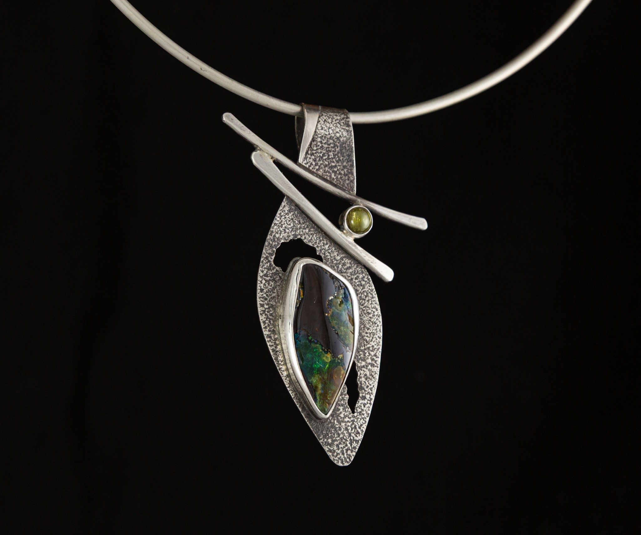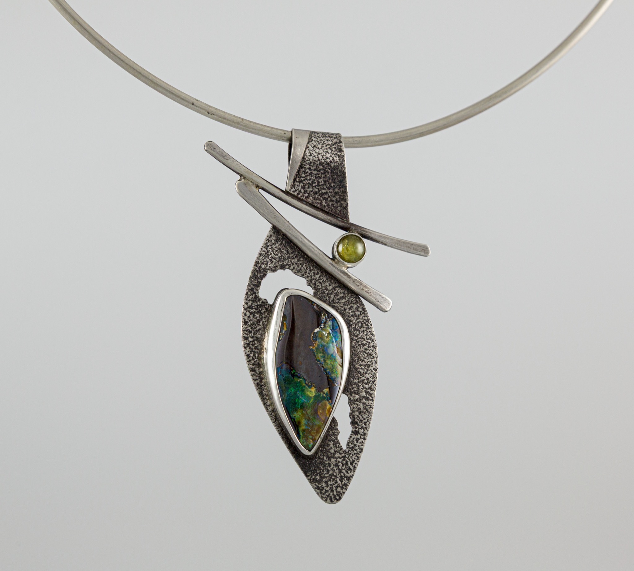 Walkabout Walkabout Walkabout Walkabout A trek across the planet.Opal from Australia Artist Blair Anderson Metals Sterling Silver Stones Boulder Opal • Green Tourmaline $350.00