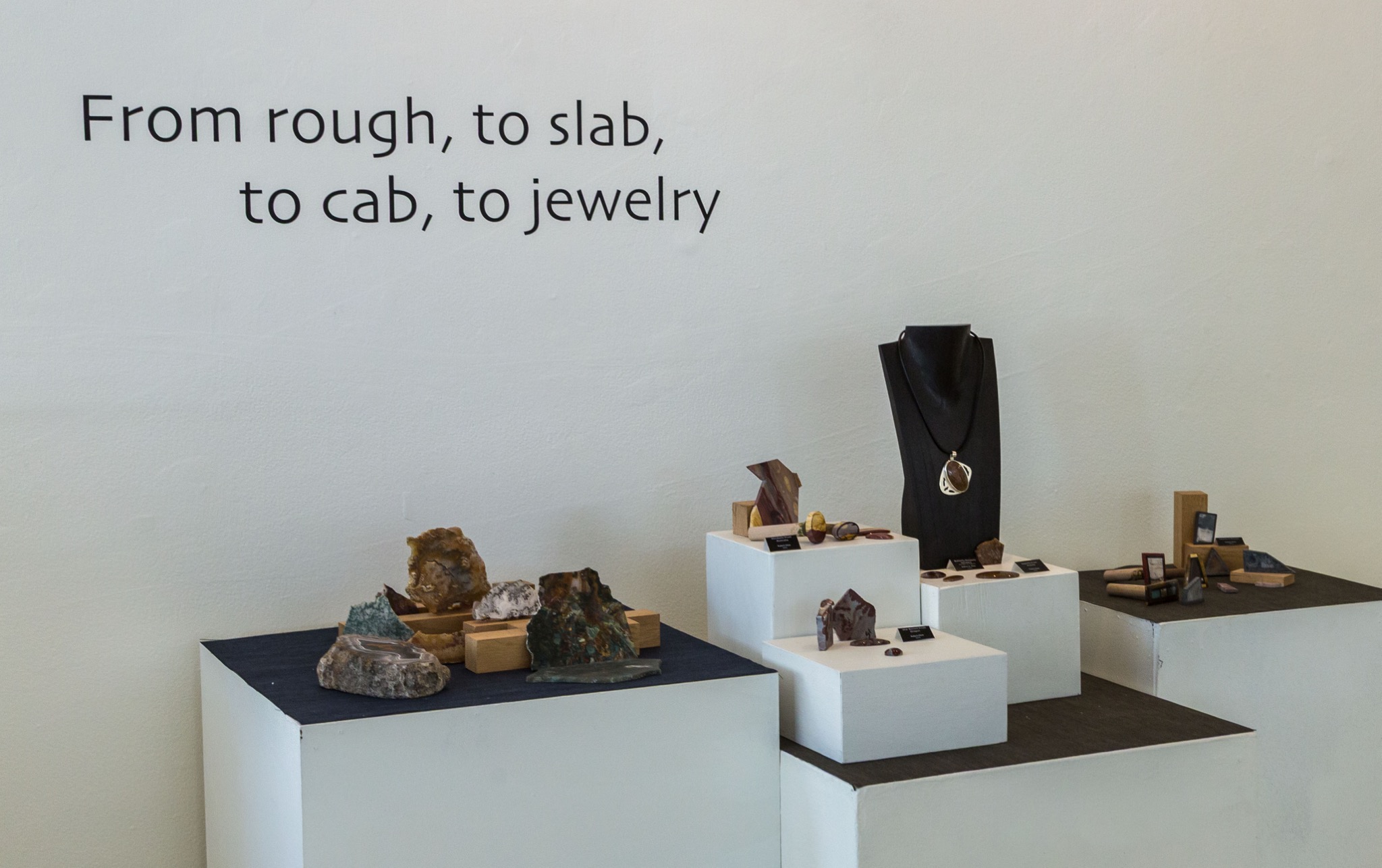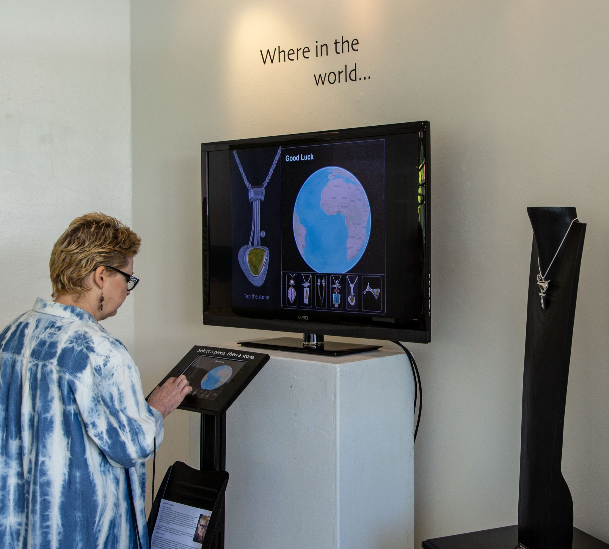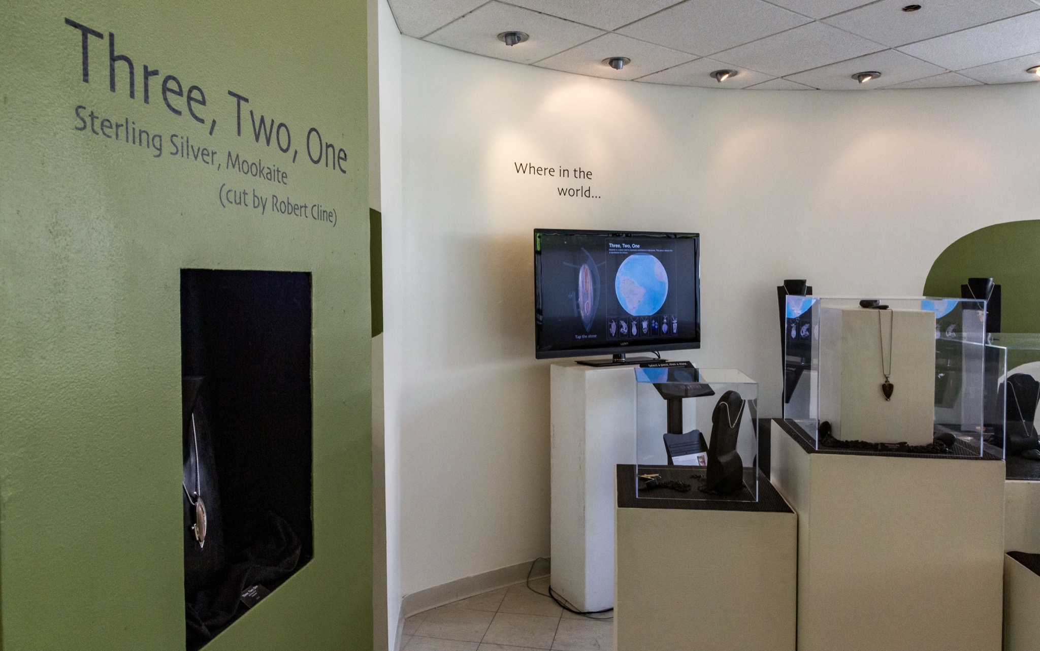 The exhibit features new works with interesting gemstones. A section of the exhibit shows how a gem goes from rough to a cabochon. Finally, and interactive globe lets the view explore where in the world gems featured in the show came from.