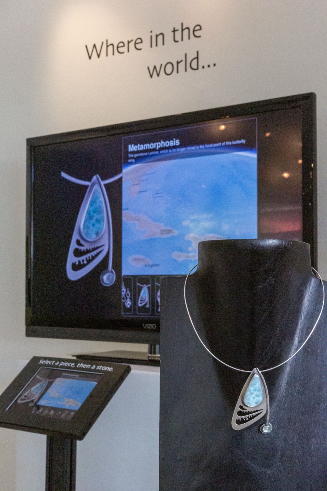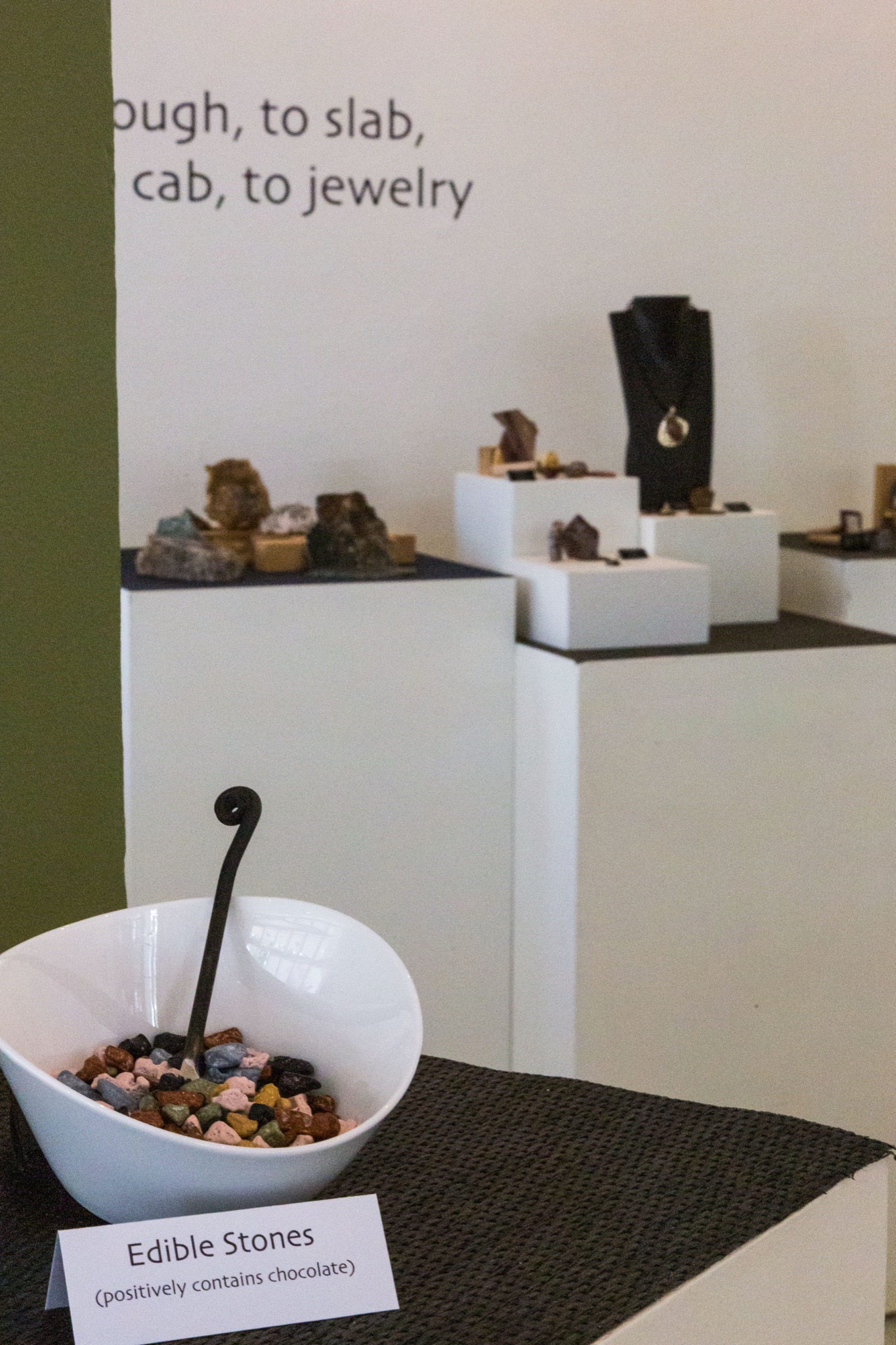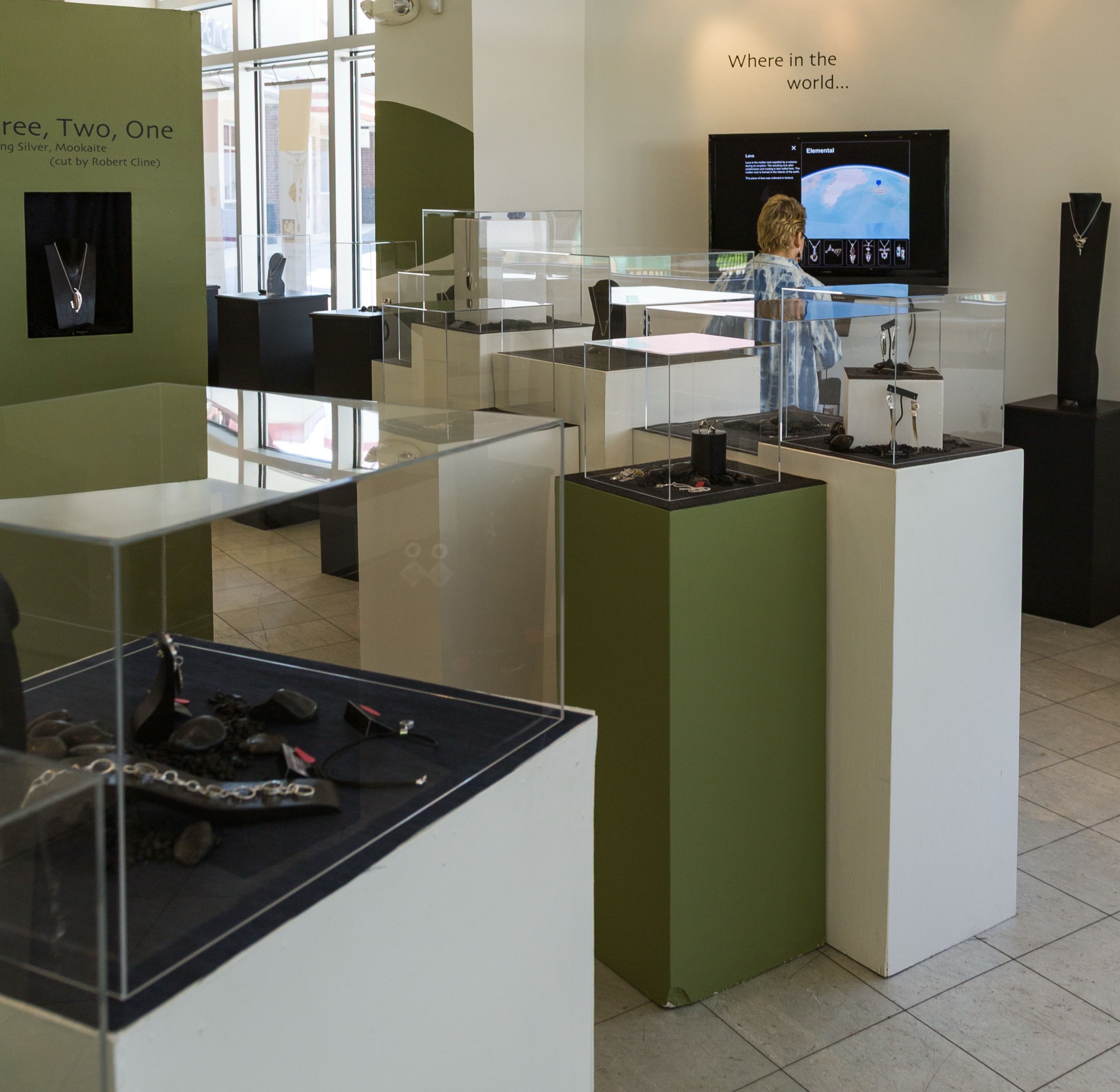 The exhibit features new works with interesting gemstones. A section of the exhibit shows how a gem goes from rough to a cabochon. Finally, and interactive globe lets the view explore where in the world gems featured in the show came from.